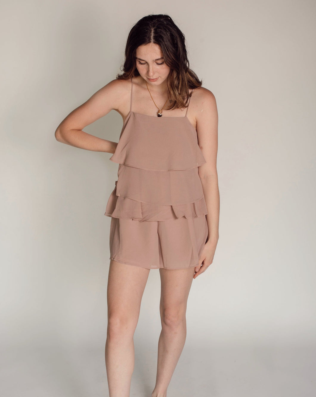 - Fall in love with our ultra-feminine tiered romper. Featuring a straight neckline and adjustable spaghetti straps, its flouncy, tiered silhouette guarantees a flattering look. With attached shorts, this enchanting piece is perfect for warmer months ahead.